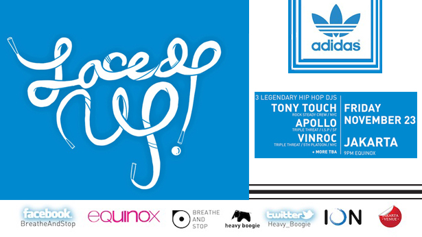 The “Laced Up” Tour features 3 of the World’s most critically acclaimed party rockers DJs Apollo (Invisibl Skratch Piklz / Triple Threat Djs /SF), Vinroc (5th Platoon / Triple Threat Djs / SF) & Tony Touch (Rocksteady Crew / NYC) in Singapore on November 15th, Kuala Lumpur 16th, Saigon 17th, Manila 22nd, Jakarta 23rd & Bangkok on the 24th.