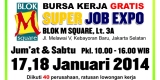 Bursa Kerja JobFairIndo, Kamis, 23 Januari 2014, Gd. Wanita Nyi Ageng, Jl. HR. Rasuna Said C22, Jak-Sel. Jam 9-4 Sore. Ada 50 PT buka lowongan. Datang & Ajak Teman Anda! Pameran 1.000 Info Lowongan. TIDAK ADA TIKET MASUK !! Daftar Perusahaan : AJE Group (Big Cola), Baramulti Group, Orang Tua Group, Sutindo Group, Melawai Group, Wings Group, Garuda Food, Johnny ...