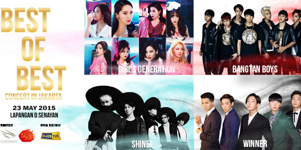 Untuk kalian Pecinta K-POP bersiaplah mendatangi Lapangan D Senayan, Jakarta, untuk menikmati acara yang bertajuk “Best of Best Concert in Jakarta”. Konser ini akan berlangsung pada 23 Mei 2015. Dikonser ini akan menampilkan beberapa grup K-POP terbaik seperti SNSD, Shinee, Bangtan Boys dan Winner yang akan menghibur penggemarnya di Indonesia. Mereka dipilih karena memang memiliki fans yang cukup banyak di Indonesia.