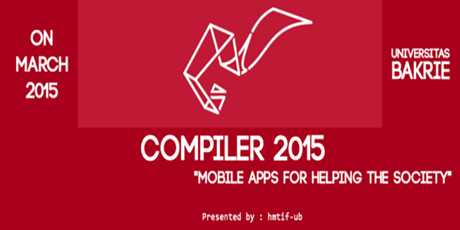 Himpunan Mahasiwa Teknik informatika (HMTIF) Universitas Bakrie kembali menyelenggarakan acara tahunannya yaitu COMPILER (Computing and Programming with Logic and Creativity) 2015. Acara yang dimulai pada tanggal 6 – 8 Maret 2015 ini mengusung tema yang sangat menarik, yaitu “Mobile Apps for Helping the Society”. Dengan mengambil tema ini para panitia berharap COMPILER 2015 dapat menjadi wadah informasi dan ilmu pengetahuan, serta wadah berkompetisi bagi siswa SMA/MA/K, Mahasiswa, dan Masyarakat umum lainnya dalam menerapkan teknologi masa kini yang berguna bagi masyarakat luas melalui aplikasi mobile.