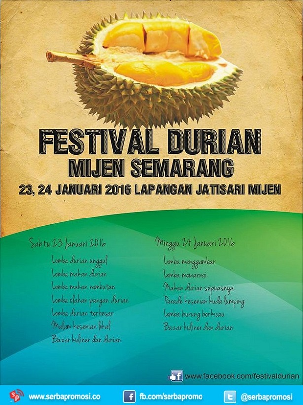 So, jangan sampai melewatkan acara-acara serunya ya dan terutama untuk menikmati durian-durian yang akan hadir dalam Festival Durian Mijen Semarang ini.