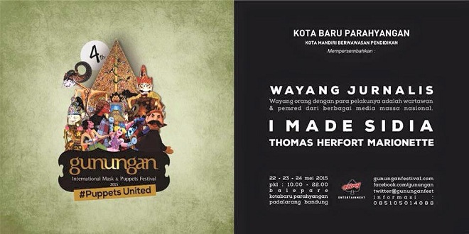 Wayang Jurnalis – Gunungan International Mask & Puppets Festival 2015 dengan tema #PuppetsUnited. Acara ini merupakan pentas wayang orang dengan para pelakunya adalah wartawan dan pemred dari berbagai media massa nasional.