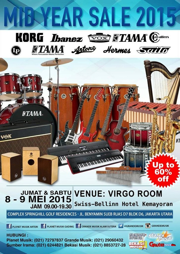 MID YEAR & SALE 2015 Up To 60% Off – Buat kalian para musician yang sedang mencari alat-alat musik, jangan sampai terlewat event yang satu ini. Akan ada spesial diskon hingga 60% untuk brand-brand ternama, seperti IBANEZ, KORG, TAMA, VOX, CAVALIERS, HERMES, ARTONE SAOITO etc.