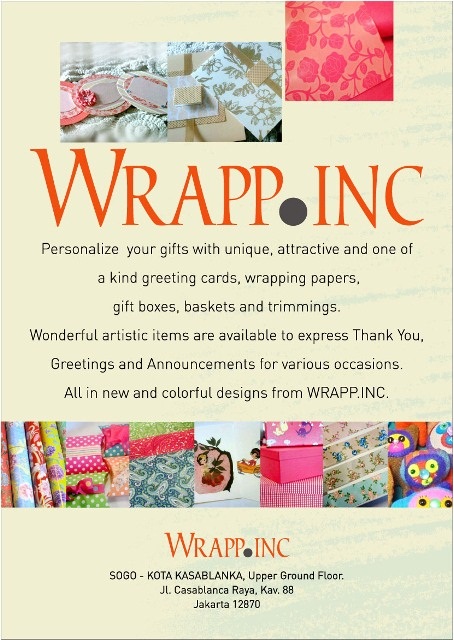Warpp. Inc July 27, 2012 Vendors 401 Views Share tweet Wrapp.INC – personalize your unique gift with attractive wrapping papers sogo – Kota KASABLANKA, Upper Ground Floor. JL. Casablanca Raya, Kav. 88 Jakarta 12870 2012-07-27 Acaraevent Share tweet